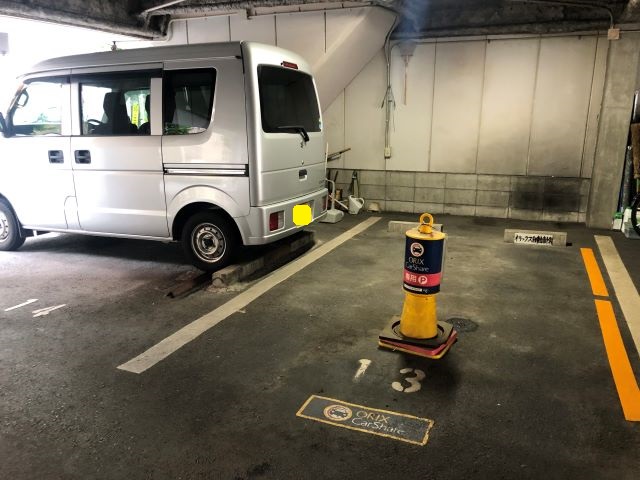 ③ 駐車場に入ってすぐ左手側にカーシェアがあります。