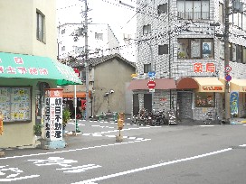 ③ らいふ薬局と朝日行政書士事務所の間をお進みください。(前面道路は一方通行)