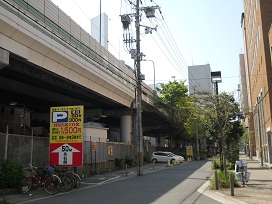 ③ 阪神高速の高架下の手前を(南方向への一方通行となります)南方向へ。駐車場全体