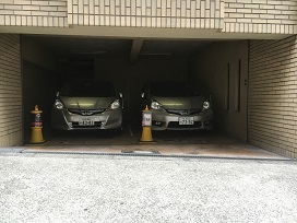 ③ 最初の交差点を越え、左側のマンション1階に駐車場がございます。