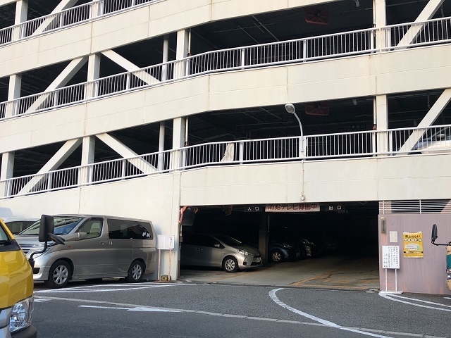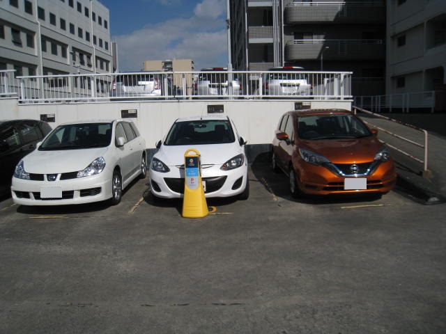 ② 左手の平置き駐車場を過ぎると、5F建ての立体駐車場がございます。