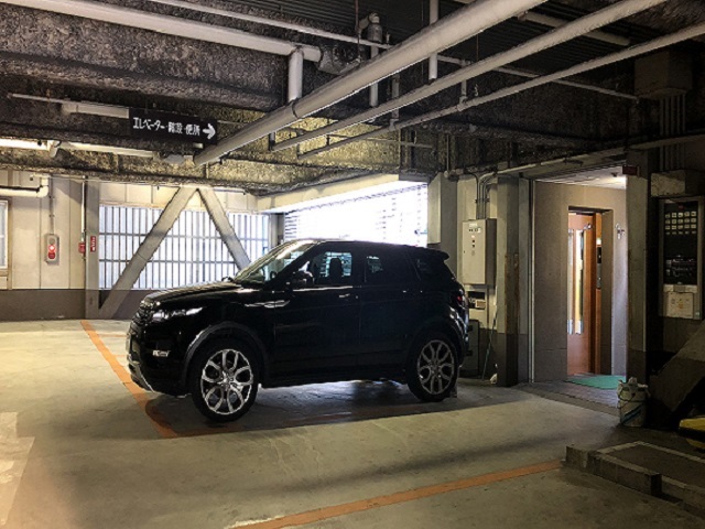 ③ 車両入出庫口から入り、エレベーターで5Fに上がります。