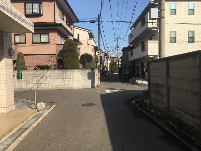 ② 1つ目の交差点を渡り右へ進み、すぐの路地を左折します。