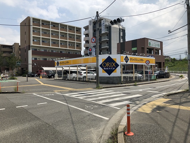 ③ 500mほど進むと交差点の一角にオリックスレンタカーがあり、その駐車場内にカーシェアがございます。