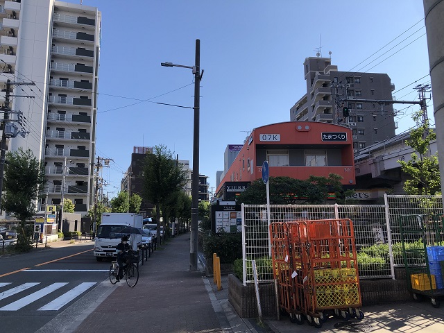 ① JR玉造駅北口を出て右側のJR環状線の高架沿いに南に170m程進むと、環状線の電車をイメージした商業施設が右側に見えてきます。 |