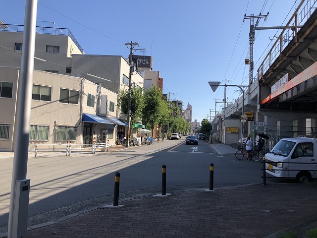② そこから更に180m程進むとJR環状線高架橋を潜る道路に出ます。道路手前を左折します。 |